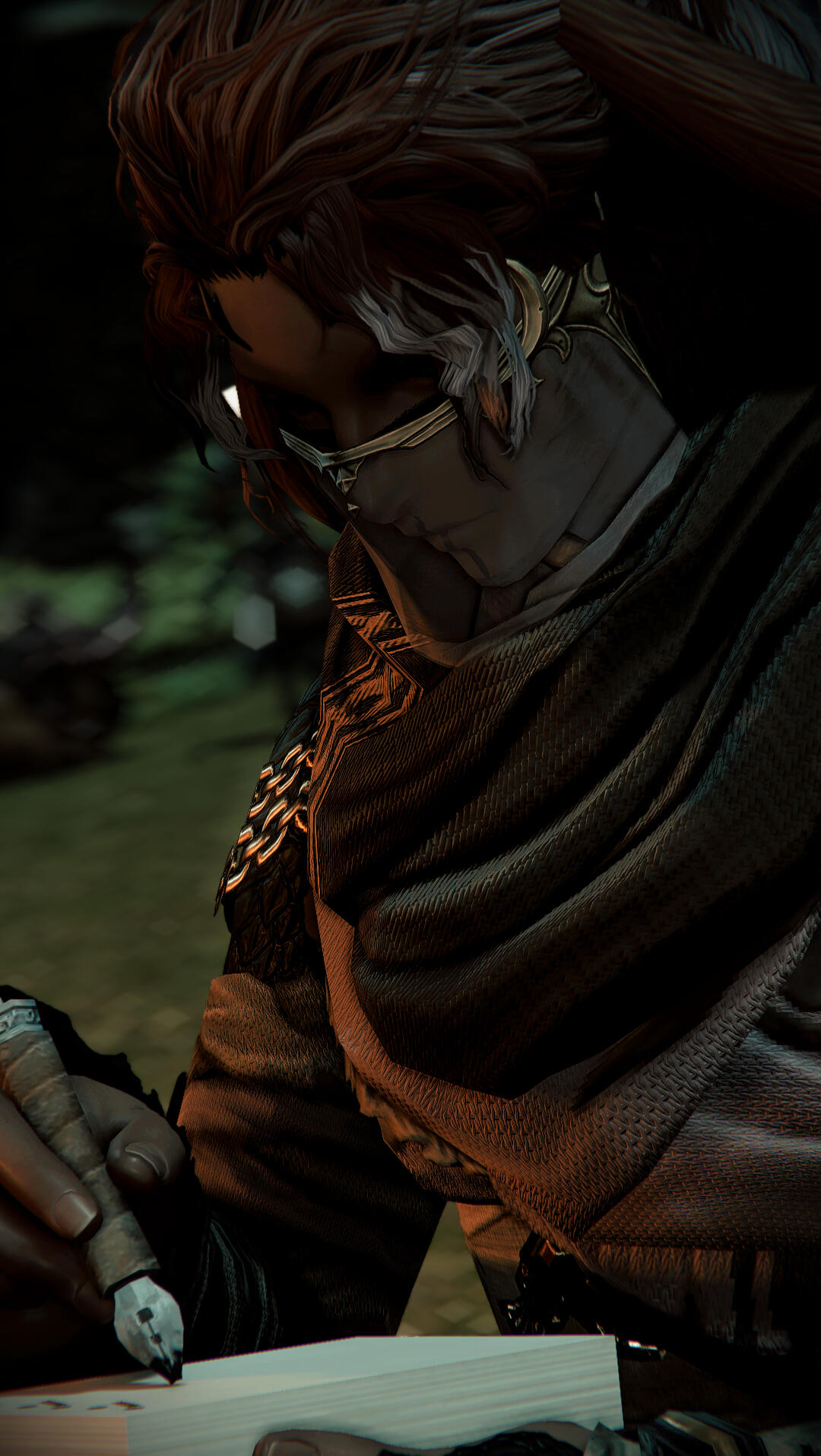 another testament to his apparent xaela heritage; black sclera, along side yellow-ish eyes. when you're face-to-face with him, there's no mistaking the fact that he is indeed a half-breed.